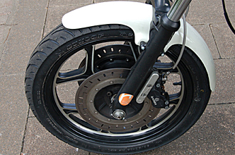 純正のフォークスタビライザーを使いつつ、オリジナルFRPフェンダーを取り付け。操縦安定性はそのままに、軽快さを実現してます。(画像の4podキャリパー、キャリパーサポートはオプションです)