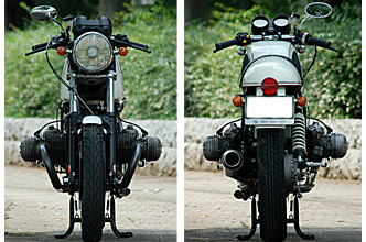 スリムさがご理解頂けるフロントビュー。大変コンパクトで扱いやすく、またノーマルより重量も軽減されてます。そしてリアビュー。ウインカーはパニアステーを付けても使えるよう、後方にマウント。後ろが重く見えるBMWを軽快に見せるための、こだわりのリア回りです。